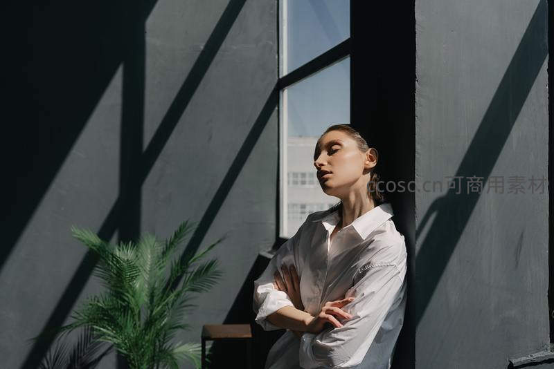 一位年轻女性身着白色衬衫,倚靠在灰色墙壁旁,阳光透过窗户投下锐利的几何阴影,营造出强烈的视觉对比和宁静的沉思氛围。