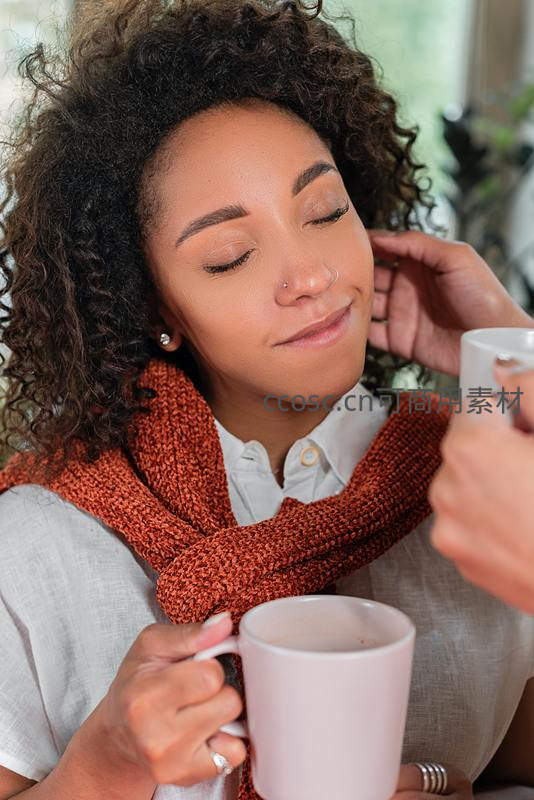 卷发女子闭目享受热饮,围巾温暖惬意时光