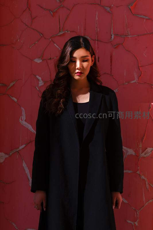 一位长发女子身着黑色长款大衣,站在一面布满裂纹的鲜红色墙壁前,眼神低垂,妆容精致,整体画面充满戏剧张力和冷艳的时尚感。