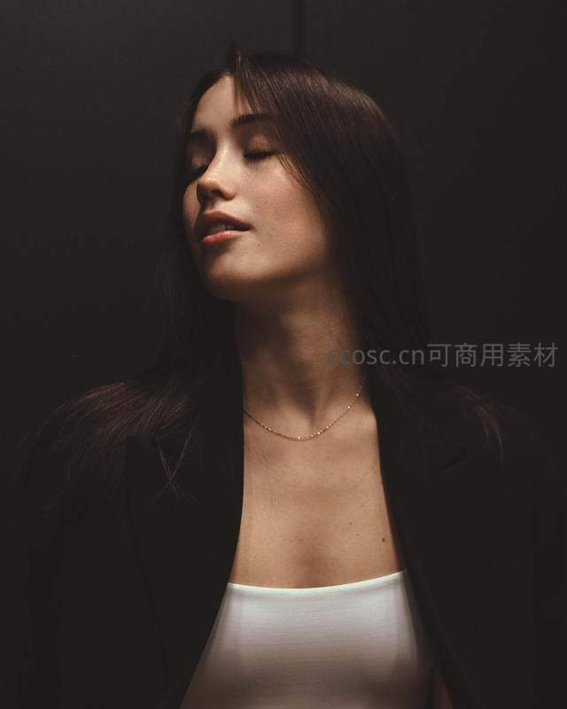 一位身穿黑色西装外套和白色内搭的女子闭目仰头,柔和侧光勾勒出她优美的颈部线条,氛围宁静而富有艺术感。