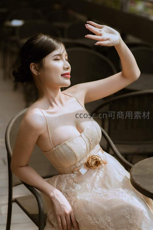 一位身着浅色蕾丝长裙的女子坐在户外咖啡椅上,微闭双眼,抬手遮阳,阳光洒在身上,营造出慵懒、浪漫的午后时光。