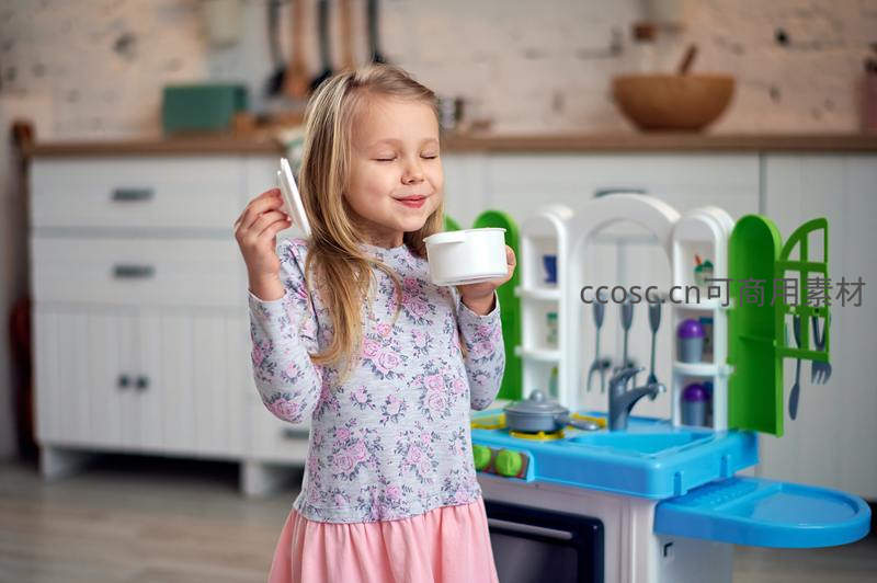 金发小女孩穿着花裙子,在色彩鲜艳的玩具厨房前,手捧小碗和勺子,闭眼享受着角色扮演的乐趣,脸上洋溢着纯真满足的笑容。