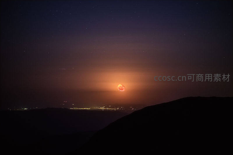 血月高悬于城市灯火之上,群星点缀深蓝夜幕,山丘轮廓静默,构成一幅融合自然奇观与都市文明的壮丽夜景。