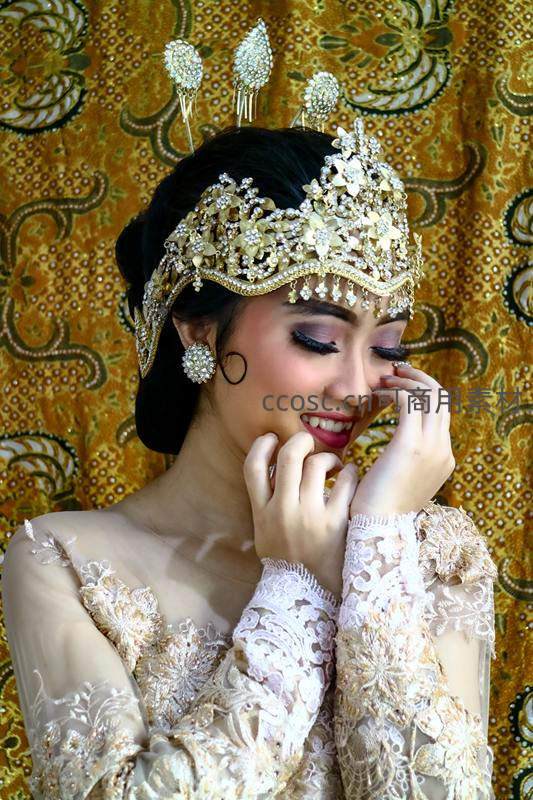 东南亚新娘头戴金冠轻抚面颊微笑