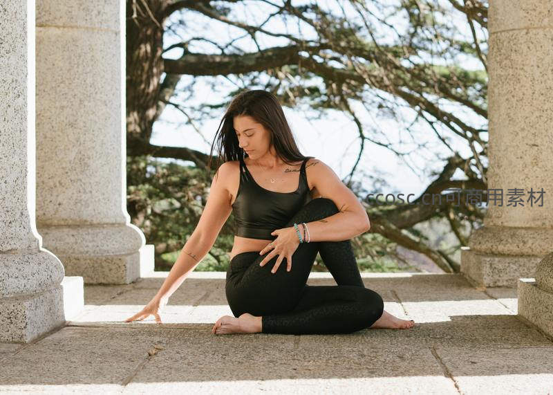 一位女子在古典石柱廊下盘腿而坐,专注练习瑜伽伸展动作,背景树木与光影交织,充满宁静力量。