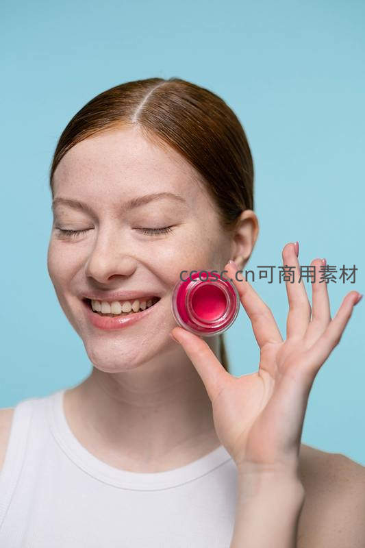 一位年轻女性面带灿烂微笑,闭眼享受护肤时刻,手中轻握一支粉色润唇膏,背景纯净浅蓝,整体氛围清新自然,传达愉悦与自信的美丽理念。