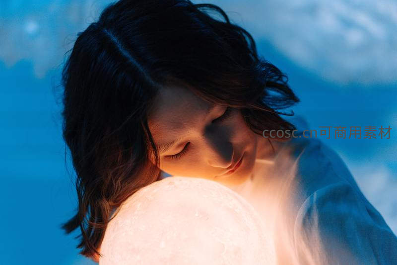 一位女子温柔依偎在散发着柔和暖光的月球灯旁,背景是深邃的蓝色星空,营造出宁静梦幻的氛围,适合冥想或睡前放松,充满诗意与慰藉。