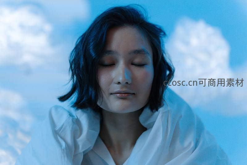 一位黑发女子身披白衣,闭目沉浸于梦幻般的蓝色天空背景中,云朵环绕,营造出超现实的宁静与冥想氛围。