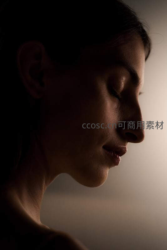 柔和侧光勾勒出女子闭目的精致轮廓,深色背景衬托其宁静神态,传递出专注、内省与艺术美感的冥想状态。