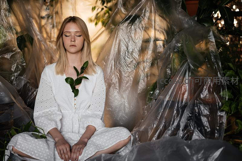 金发女子身着白色镂空连衣裙,盘腿静坐于被透明塑料布包裹的绿植之间,营造出人与自然交融又略带疏离的艺术氛围。