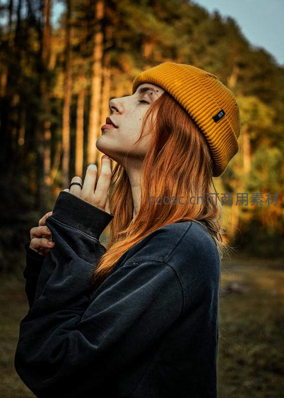 金秋森林中,红发女孩戴着黄色针织帽,闭目仰头,手轻触脸颊,沉浸于自然怀抱,感受宁静与平和。