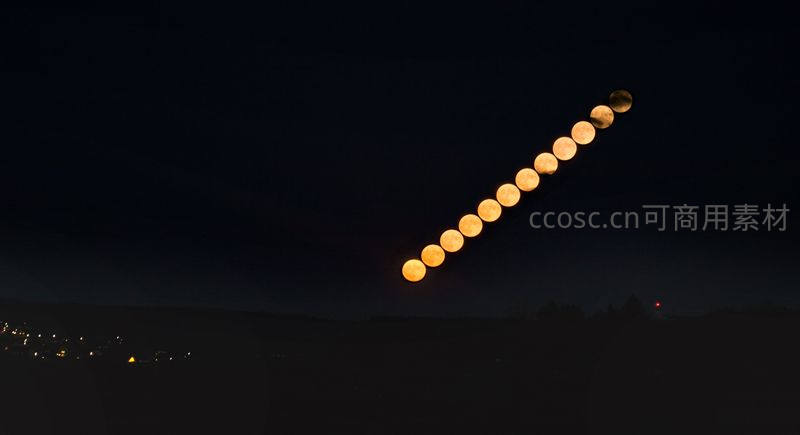 通过长时间曝光拍摄,月亮在夜空中划出一道优美的金色弧线,地平线下隐约可见城市的点点灯火。