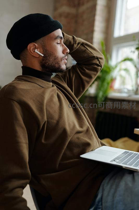 一名戴着黑色贝雷帽和无线耳机的男子,正靠在椅子上闭目养神,享受片刻宁静。他的膝上放着一台打开的笔记本电脑,似乎刚结束一段工作或学习。