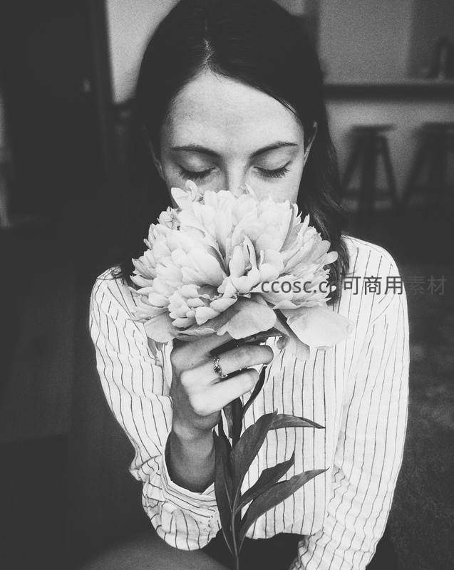 女子闭眼轻嗅盛开的牡丹,黑白影调突出质感与情绪,传递人与自然和谐共处的诗意瞬间。