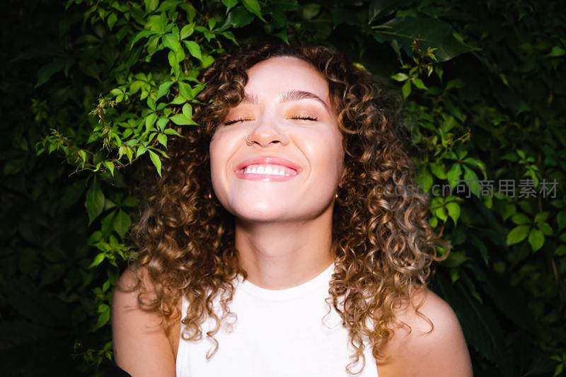 阳光洒在女孩脸上,她闭眼微笑,金色卷发蓬松柔美,身后是茂密绿叶背景,传递出纯粹的幸福与活力。