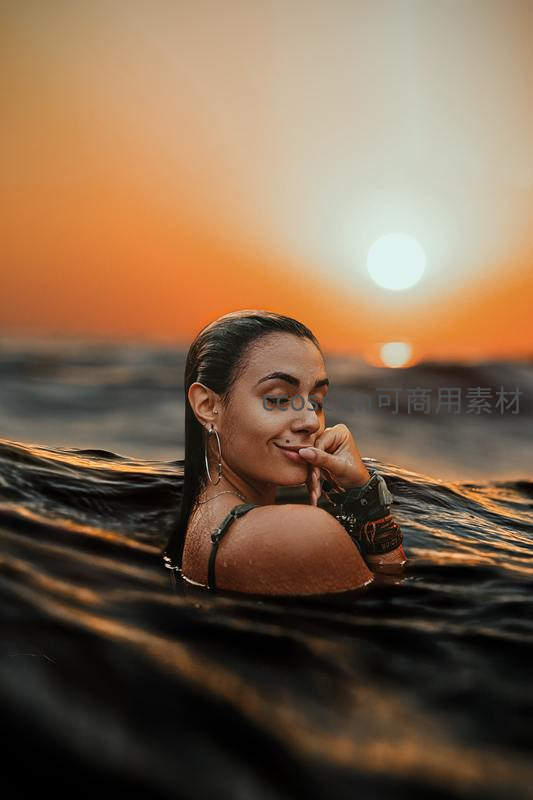 女子半身浸于海水中,面朝落日微笑,金色余晖洒在肌肤与波浪上,营造浪漫、温暖且富有诗意的黄昏场景。