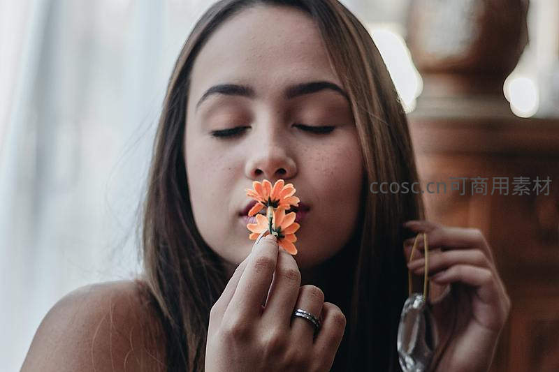 女子闭目轻嗅手中橙色小花,神情陶醉,背景虚化营造温馨氛围,展现人与自然的亲密瞬间,传递慢生活与感官愉悦的美好感受。