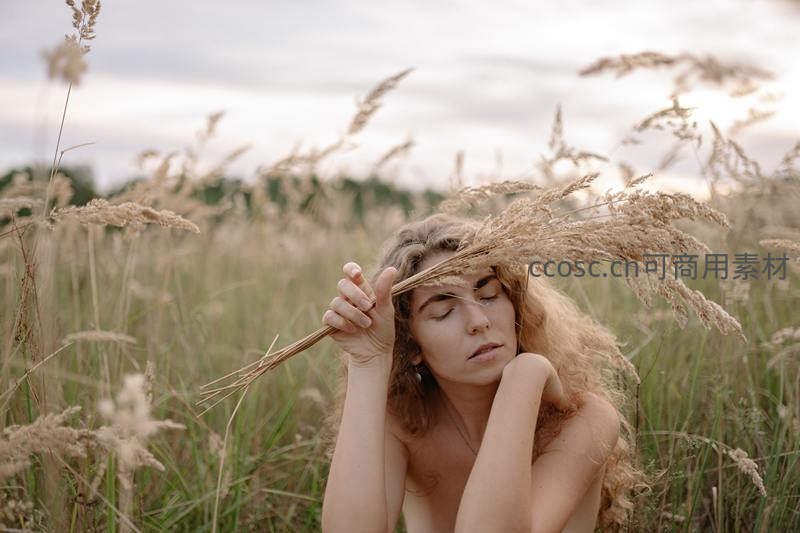 卷发少女躺在夕阳下的野草丛中,手持一束干枯麦穗遮挡阳光,闭目享受微风拂面,画面充满诗意与自由气息,展现人与自然和谐共处。