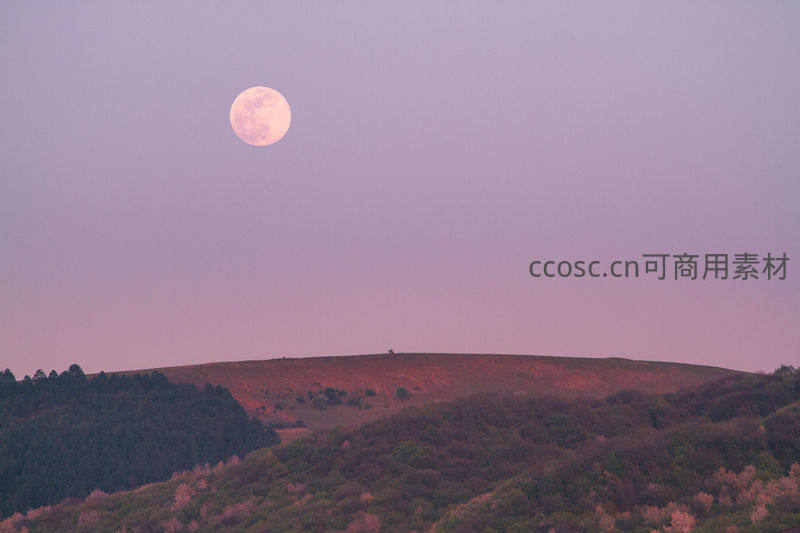 在温柔的粉紫色黄昏时分,一轮皎洁的满月悬挂在连绵起伏的山丘之上,为大地披上一层梦幻般的色彩,宁静而美好。