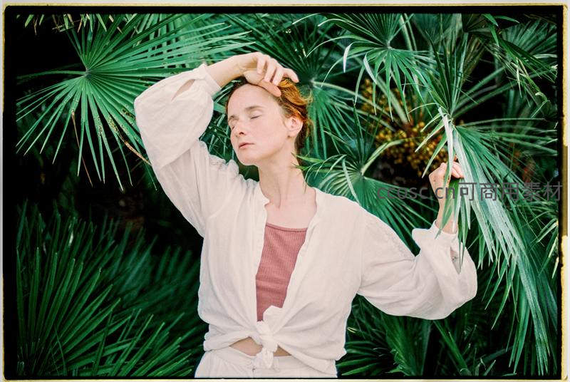 一位女子置身于茂密的热带棕榈叶间,闭目伸展身体,享受自然的怀抱,画面充满生命力与平和感,仿佛在进行一场户外的冥想或瑜伽练习。