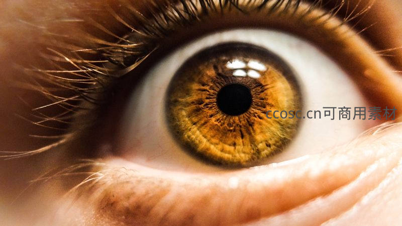 这张图片展示了人类眼睛的极致微距特写,琥珀色的虹膜纹理清晰,睫毛根根分明,瞳孔深邃,光影效果突出了眼部结构的立体感与生命力。