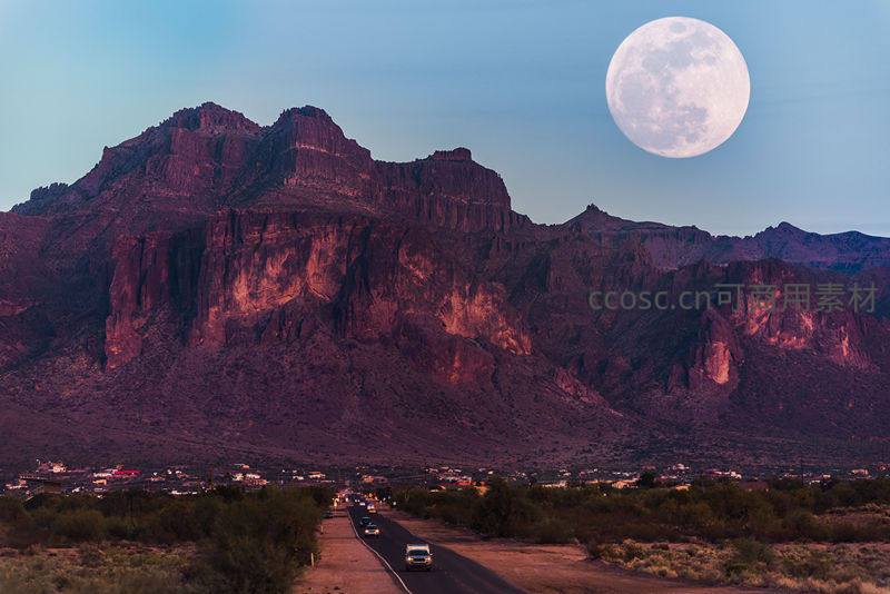 一轮皎洁的满月悬于雄伟山峦之巅,山脚下公路车流不息,远处小镇灯火点点,构成壮丽的自然与人文画卷。