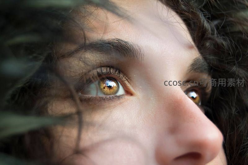 女性仰望天空,棕色瞳孔中倒映着光斑,蓬松卷发半遮面庞,营造出朦胧而富有故事性的视觉氛围,充满诗意与遐想。