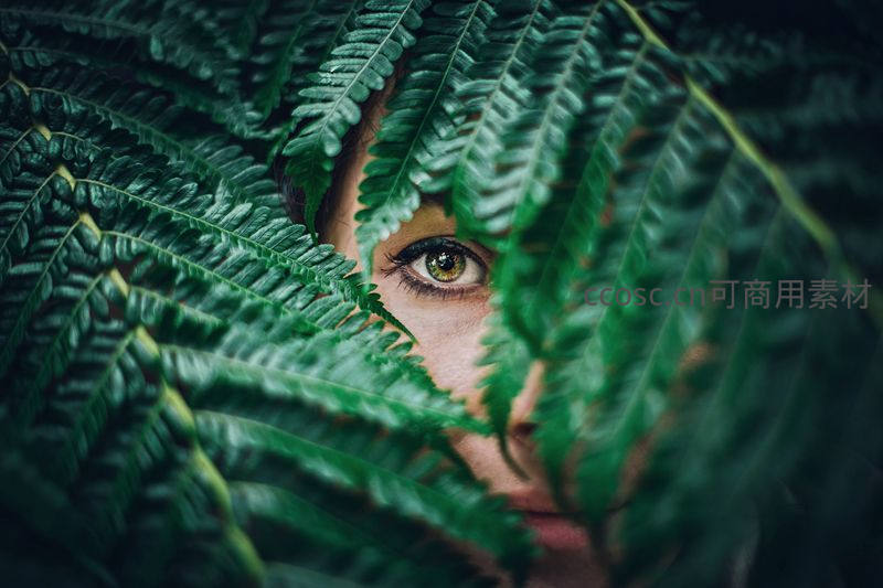 在茂密深绿的蕨叶缝隙中,一双明亮的绿色眼睛悄然凝视,营造出人与自然交融的神秘氛围,仿佛森林精灵在静谧中观察世界。