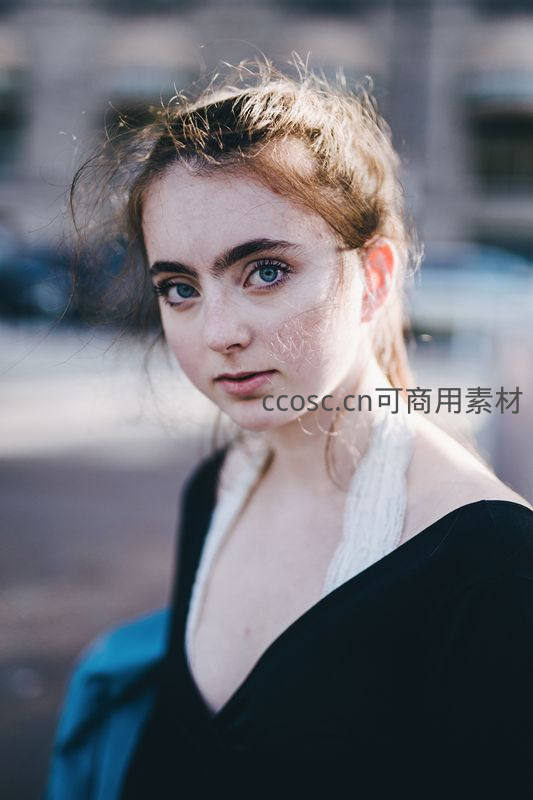 一位年轻女孩在城市街头驻足回眸,阳光温柔地洒在她带着雀斑的脸颊上,清澈的蓝眼睛与随意的发型,展现出青春与自然的生活气息。