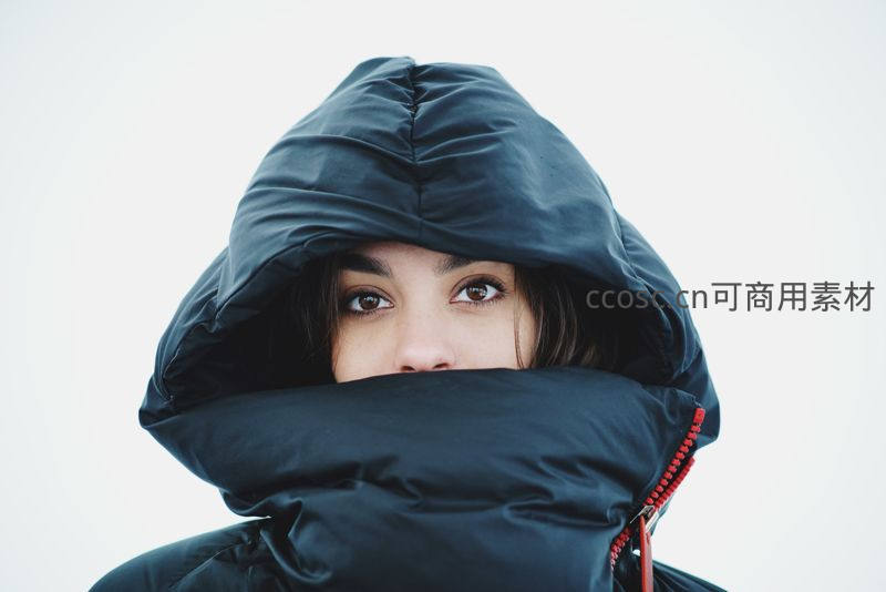 一位女性将自己裹在深色羽绒服的连帽中,只露出一双深邃的眼睛,背景简洁纯净,营造出神秘又时尚的冬日氛围。