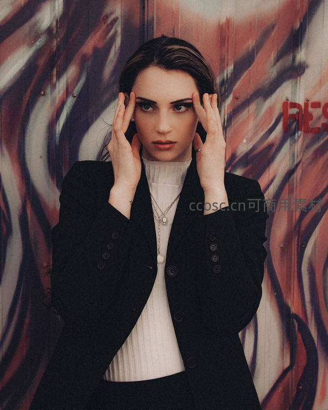 一位穿着黑色西装外套和白色高领衫的年轻女性,双手轻触太阳穴,站在色彩斑斓的涂鸦墙前,展现出自信与艺术感。