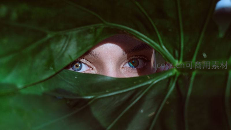 一双明亮的蓝绿色眼睛从一片宽大的深绿叶片孔洞中透出,叶片的脉络清晰可见,形成天然画框,充满探索与好奇感。