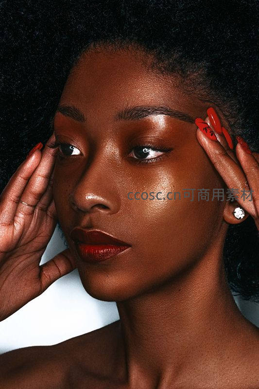一位黑皮肤女性以双手轻托脸颊,目光坚定,红唇与高光妆容相得益彰,展现出强烈的自信与现代时尚美感。