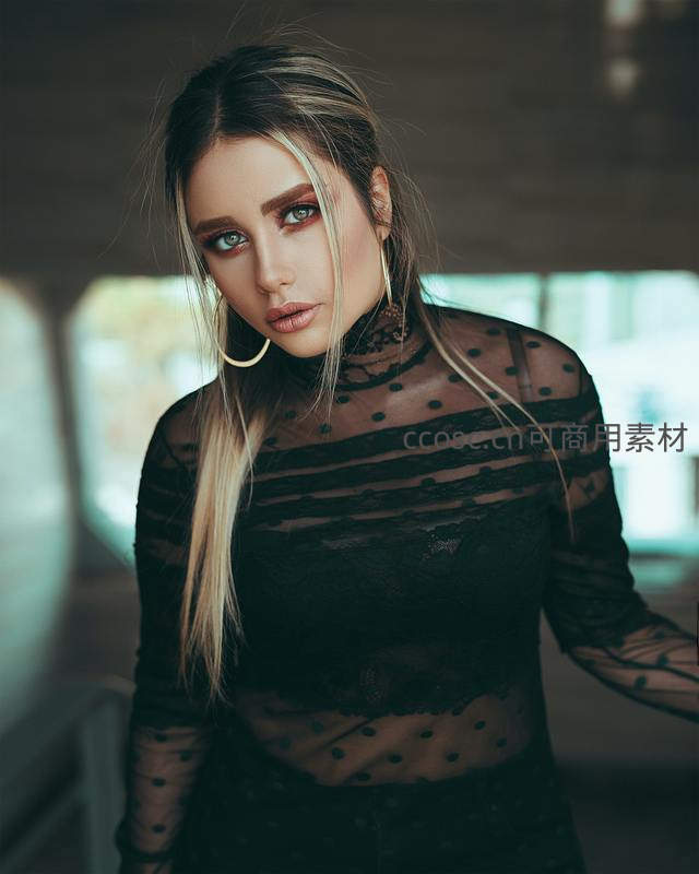 女子身着黑色透视波点高领上衣,佩戴金色大耳环,眼神深邃地直视前方。柔和自然光从窗边洒入,凸显其精致妆容与神秘气质。