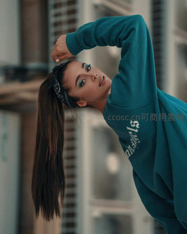 活力少女街头摆拍,蓝绿卫衣亮眼