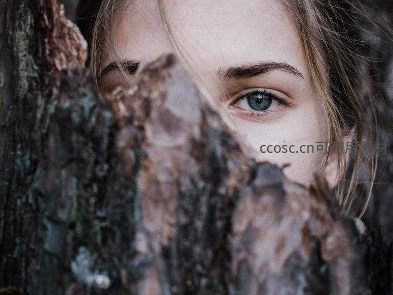 女子从粗糙树干后探出半张脸,仅露一只蓝色眼睛,营造神秘氛围,自然与人文交织的创意人像作品。