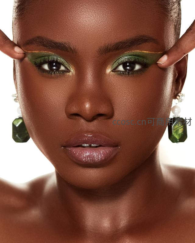 深色肌肤搭配亮眼的绿色与金色眼影,佩戴几何切割的绿色宝石耳环,展现大胆前卫的时尚美学与精致妆容细节。