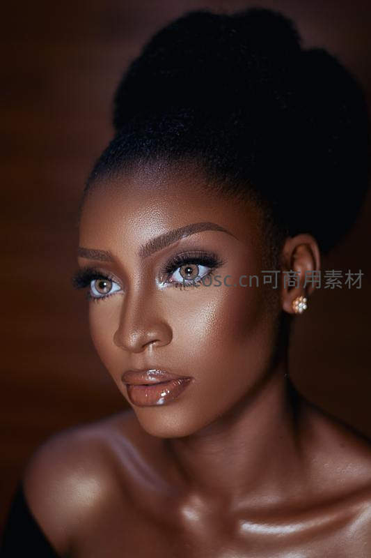一位黑人女性以完美妆容示人,高光勾勒面部轮廓,眼妆精致,眼神深邃自信,尽显高贵典雅气质。
