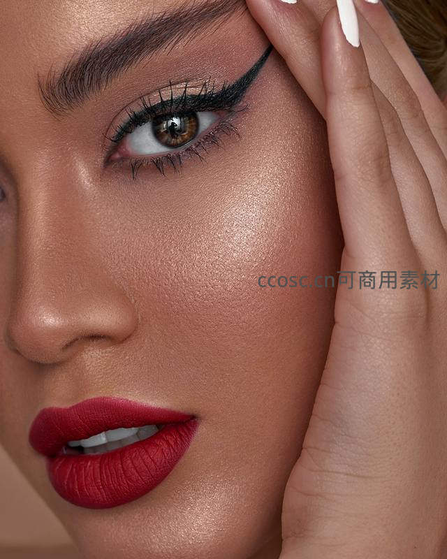 女性妆容精致,浓重猫眼线搭配鲜红唇色,手轻抚脸颊,肌肤泛着细腻光泽,散发成熟性感魅力。