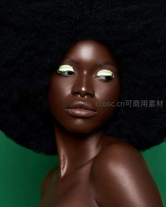 拥有蓬松黑发的非洲女性以荧光绿眼影点缀双眸,搭配光滑肌肤与纯绿背景,凸显大胆艺术美感。