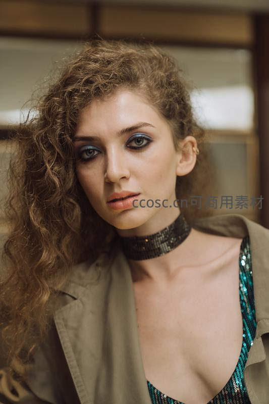 卷发女子身穿亮片吊带与卡其色外套,在柔和室内光线下展现优雅与前卫融合的时尚造型。