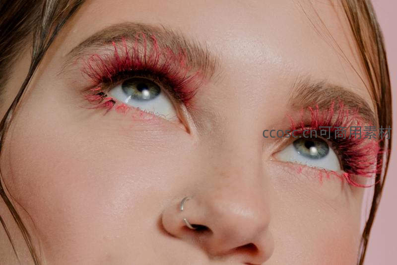 超近距离捕捉女性双眼,鲜艳粉色假睫毛与清澈蓝眸形成强烈对比,搭配小巧鼻环,散发梦幻又前卫的时尚气息。