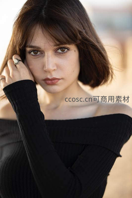 年轻女性身着黑色露肩针织衫,手托脸颊凝视前方,神情专注而略带忧郁,背景虚化突出主体情绪表达。
