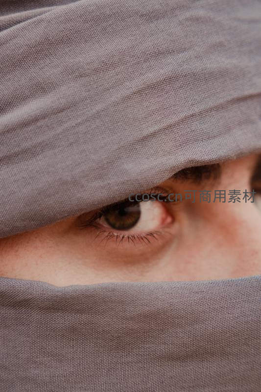灰色面纱半遮面容,仅露出一只深邃而富有情感的眼睛,细腻的皮肤纹理与布料褶皱在柔和光线下营造出静谧而神秘的氛围。