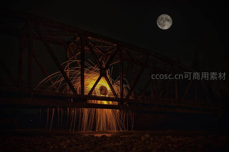 在皎洁月光下,一座古老的钢铁桥梁被绚烂的火花点亮,构成一幅充满力量与诗意的夜间景象。