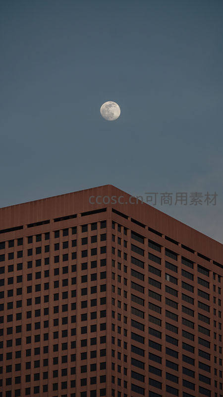一轮明月悬于现代摩天大楼的尖顶之上,冷峻的建筑线条与柔和的月光形成对比,展现都市的静谧一面。