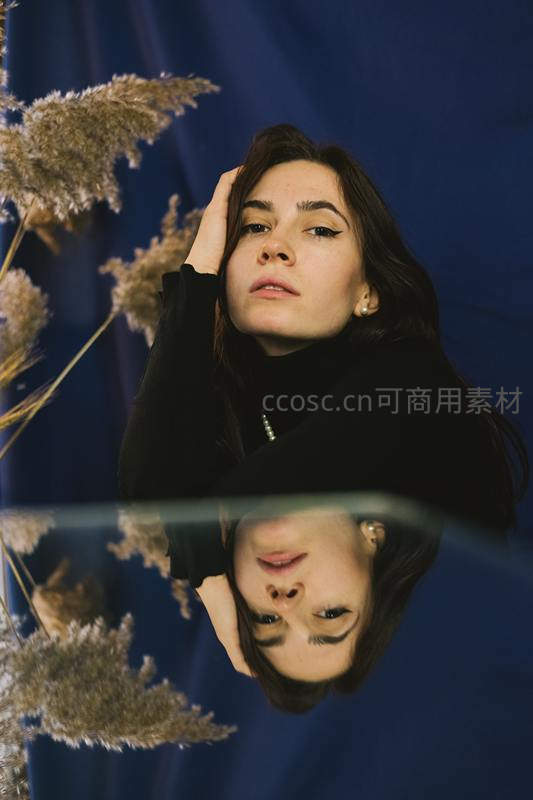 一位身穿黑色高领衫的女子在深蓝色背景前沉思,手托脸颊,身旁有干枯芦苇,镜面倒影增添了画面的艺术感与神秘氛围。