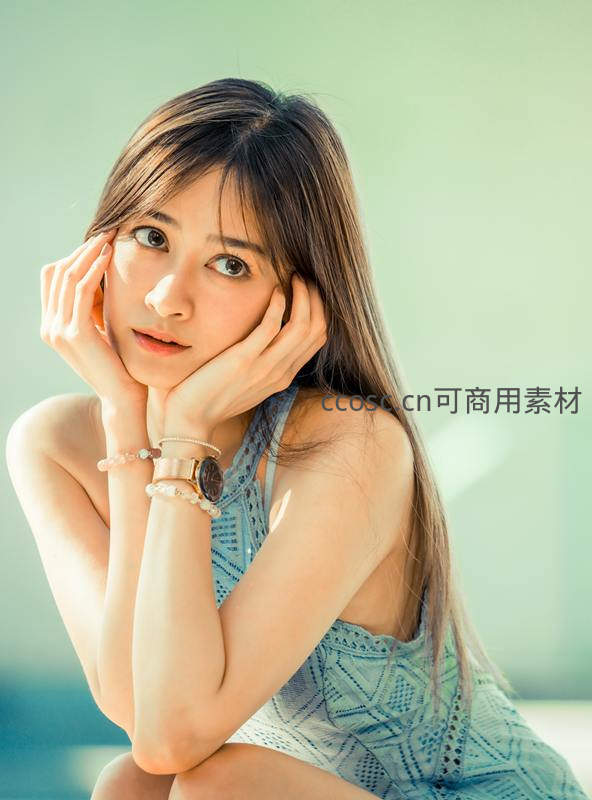 身穿蓝色镂空连衣裙的少女双手托腮,眼神温柔地望向一侧,背景柔和,腕上佩戴多款手链,整体画面充满夏日清新与宁静感。
