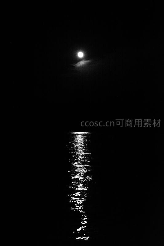 漆黑的夜幕下,一轮明月在水面上投下笔直而明亮的倒影,如一条通往未知的银色小径,宁静而神秘。