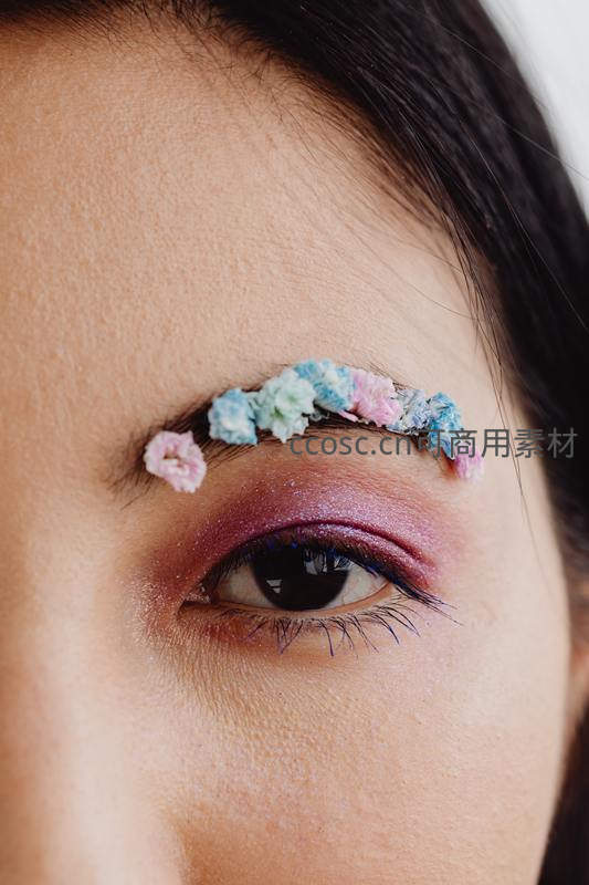 眉毛上精心点缀着小巧的粉色与蓝色花朵装饰,搭配浓郁的紫红色眼影,展现出大胆前卫的创意彩妆风格,充满艺术气息。